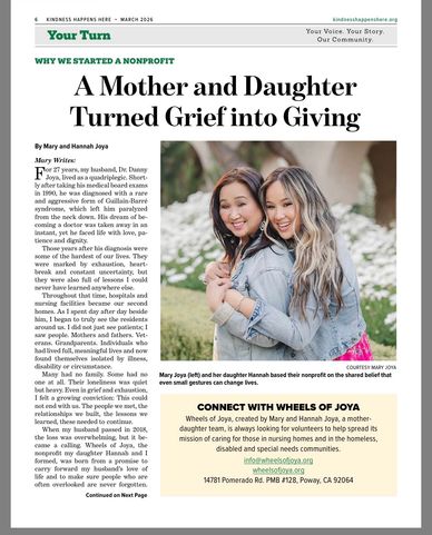 We were so honored that FOX 5 San Diego recognized my mom, Mary Joya, as a finalist in their Remarkable Women series for her heart‑centered work serving others. A few years later, we officially launched as Wheels of Joya, but this feature shows that our mission to bring hope, joy, and love has been happening long before we had a formal nonprofit name. Seeing our story shared reminds us how God has used our family’s journey to make a difference in the community.
